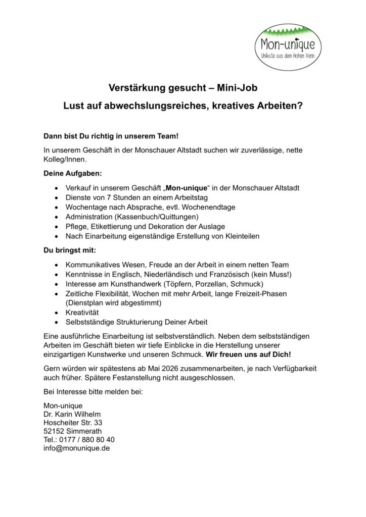 Willkommen in der virtuellen Heimat meines Geschäfts Mon-unique in der Monschauer Altstadt. Hier können Sie nach Geschenken stöbern, meine selbst gestalteten Werke anschauen, anfassen, und sich beraten lassen. Zur Auswahl gibt es frostfeste Gartenkeramik, Tierskulpturen sowie individuelle Tassen, Schalen und Kunstgegenstände, Porzellan-und Glasschmuck, Vasen, und vieles mehr. Selbstverständlich sind meine Glasuren bleifrei.